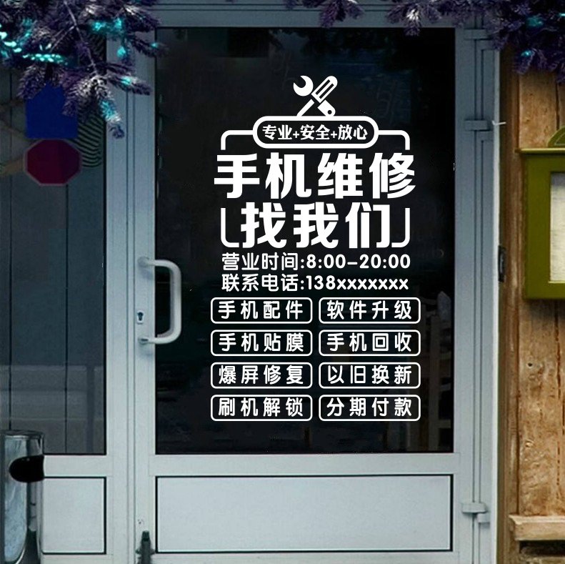 手机维修玻璃门贴纸数码通讯手机店装饰墙贴店铺橱窗广告文字贴。热门设计联盟服务商
